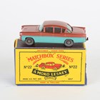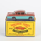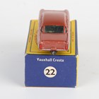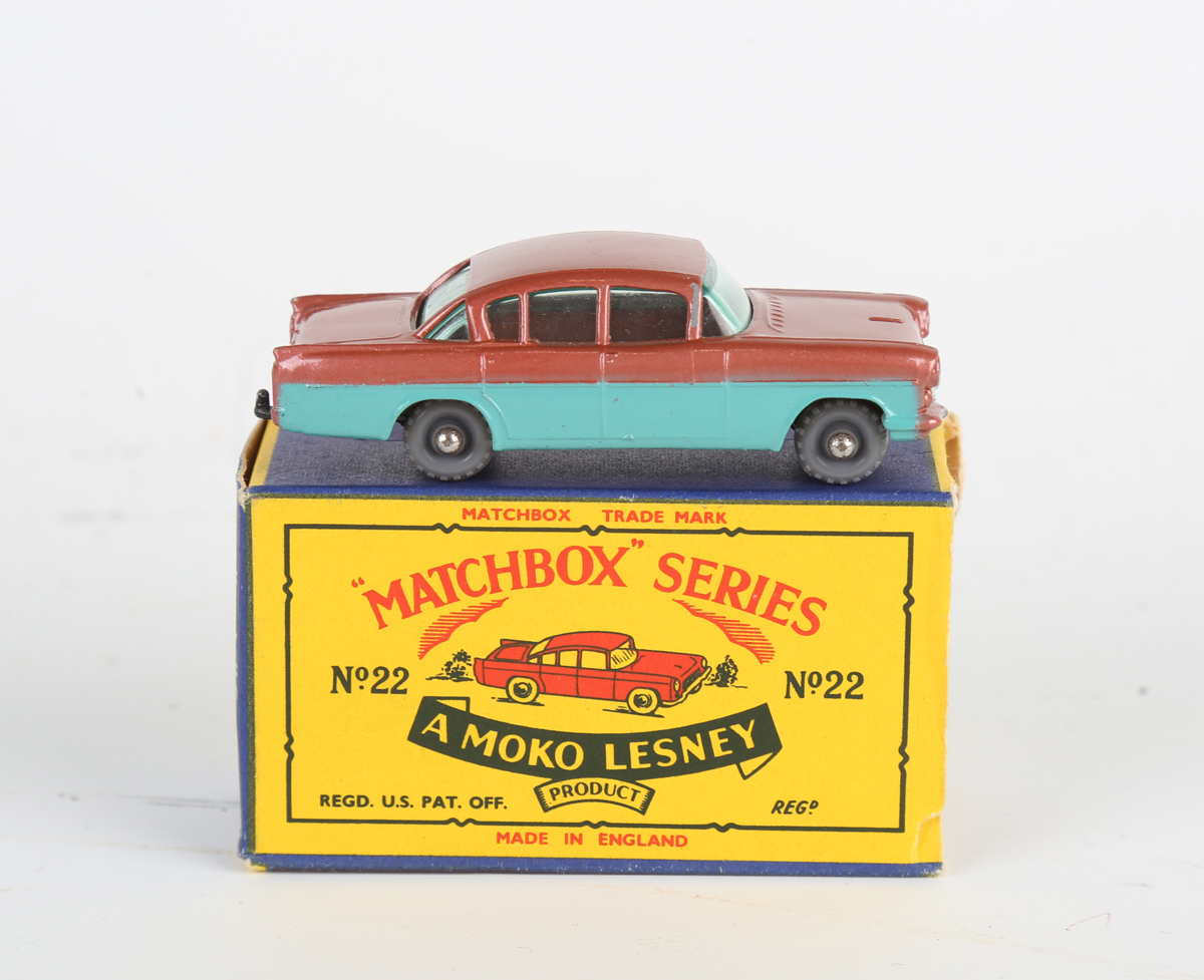 A Matchbox Series Moko Lesney No. 22B Vauxhall Cresta with metallic dark pink upper body, turquoise sides, black base and grey plastic wheels, within a B type box (box lightly creased, scuffed and lacking end flap).