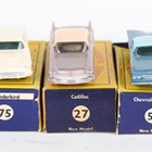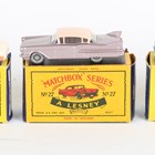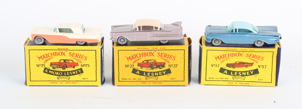 Three Matchbox Series Lesney and Moko Lesney American cars, comprising No. 27c Cadillac Sixty Special in lilac with light pink roof, No. 57b Chevrolet Impala and No. 75A Ford Thunderbird with dark blue base, all boxed (boxes lightly creased and scuffed).