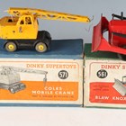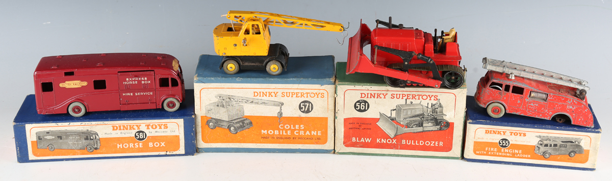 Nine Dinky Toys and Supertoys vehicles, comprising No. 514 Guy van 'Slumberland', No. 514 Guy van 'Lyons', No. 513 Guy flat truck with tailboard, No. 522 Big Bedford lorry, No. 581 Horse Box, No. 555 Fire Engine, No. 561 Blaw Knox bulldozer, No. 563 heavy tractor and No. 571 Coles mobile crane, all boxed (playwear and paint chips, boxes creased, scuffed, torn and stained).