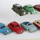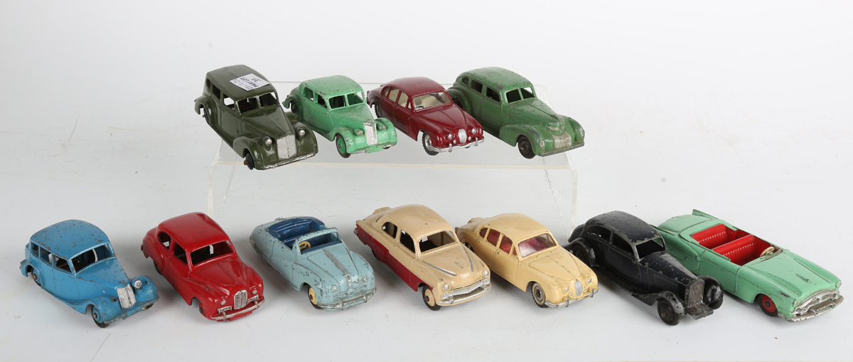 Eleven Dinky Toys cars, including No. 405 Austin Somerset, No. 164 Vauxhall Cresta, two No. 195 Jaguar 3.4 litre, No. 30b Rolls-Royce and No. 39A Packard (playwear and paints chips), together with a boat trailer.