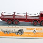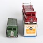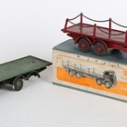 A Dinky Toys No. 505 Foden flat truck with chains, 2nd type, in maroon, boxed, and a Foden flat truck, 1st type, in green (paint chips, box faded, scuffed and with original owner's name).
