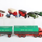 Eighteen Dinky Toys and Supertoys vehicles, including No. 987 ABC TV mobile control room, boxed with camera, No. 116 Volvo 1800S, cased, two No. 164 duo colour Vauxhall Cresta, No. 930 Bedford Pallet Jekta van, Guy van 'Heinz', Foden wagon and trailer 'British Road Services' and French Dinky Toys No. 32D fire engine (restoration, repainting and some paint chips).