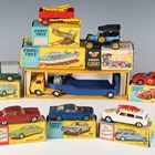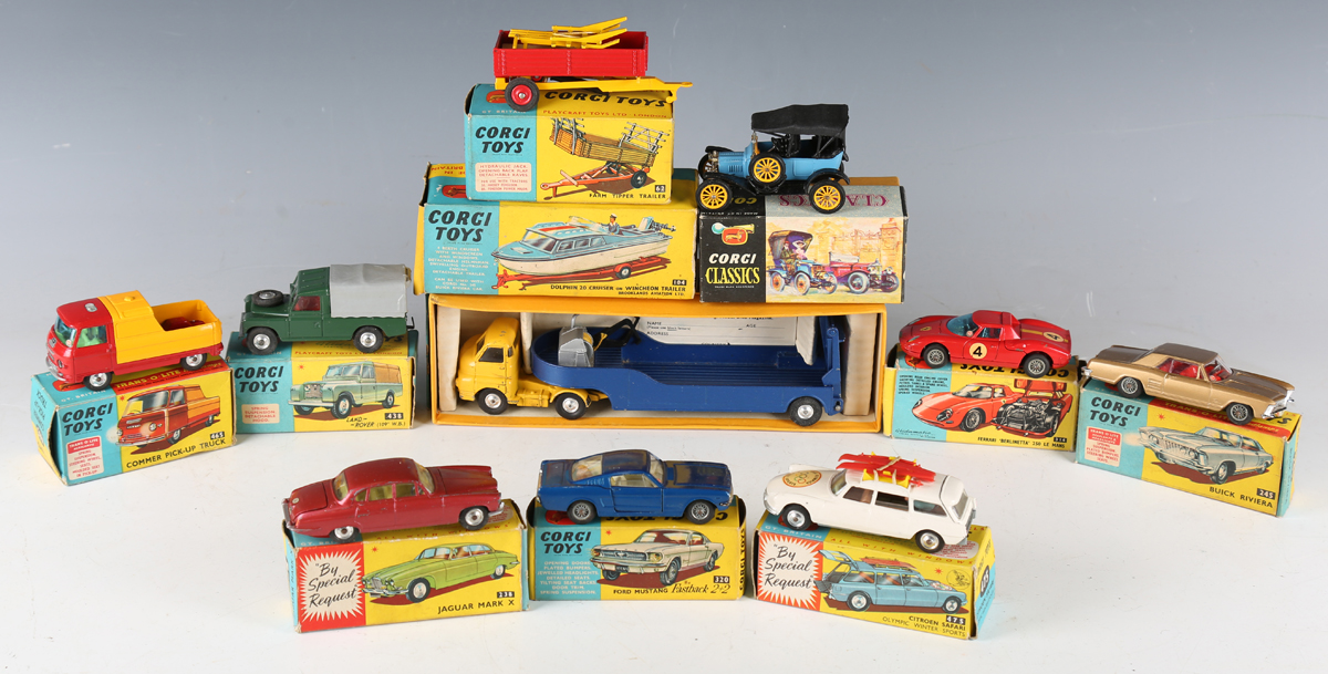 Nine Corgi Toys, comprising No. 438 Land Rover, No. 245 Buick Riviera, No. 314 Ferrari Berlinetta 250 Le Mans, No. 320 Ford Mustang Fastback 2+2, No. 475 Citroën Safari Olympic winter sports, No. 465 Commer pick-up truck, No. 238 Jaguar Mark X, No. 104 Dolphin cruiser on Winchon trailer and No. 62 farm tipper trailer, together with a Corgi Toys Major No. 1100 Carrimore low loader and a Corgi Classics No. 9013 1915 Ford, all boxed (some paint chips, boxes lightly creased and scuffed, some have detached end flaps and tabs).