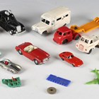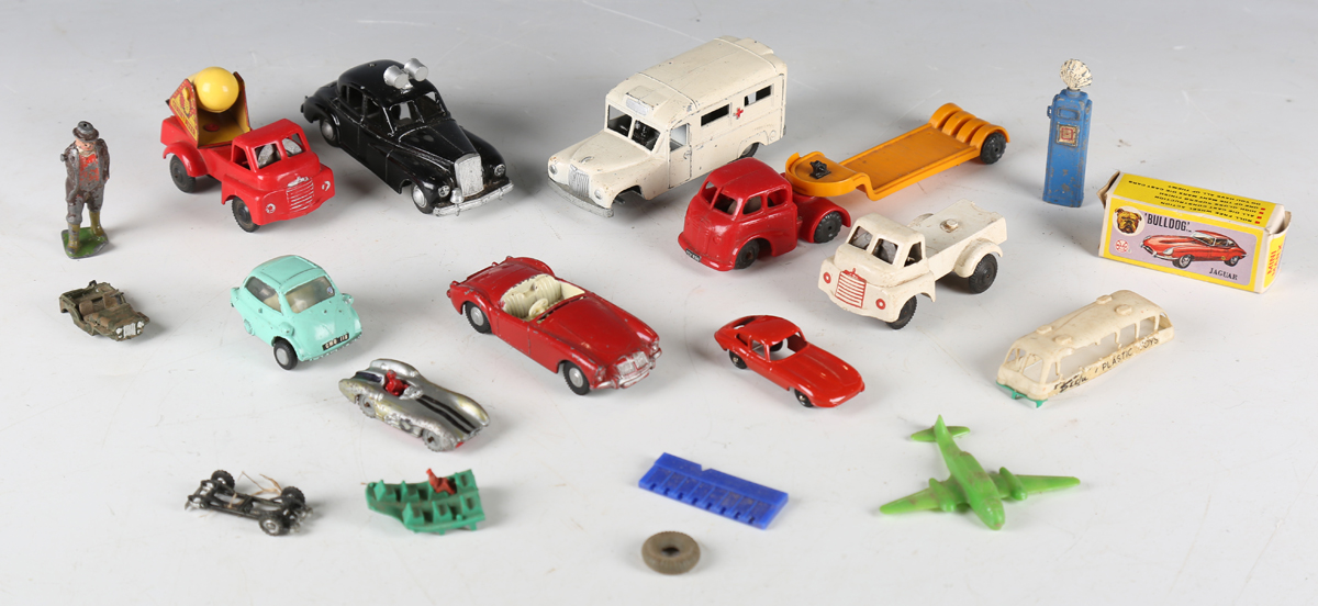 Two Tri-ang Spot-on cars, comprising No. 104 MG MGA and No. 118 BMW Isetta, together with a Budgie Toys Wolseley Six-Eight police car, an ambulance, a Marx 'Bulldog' Jaguar and other vehicles and accessories (paint chips and faults).