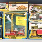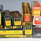 A group of Corgi vehicles, comprising Gift Set No. 10 Tank Transporter and Centurion MK-III tank, No. 904 Tiger II tank, No. 1152 Mack truck with Gloster petrol tanker, No. 1155 Skyscraper Tower Crane, No. 1106 Mack container truck, No. 413 Mazda motorway maintenance truck, No. 461 Police 'Vigilant' Range Rover, No. 414 Coastguard Jaguar XJ12C, No. 402 Ford Cortina Police car and No. 160 Hesketh 308 F1, all boxed (boxes creased, torn and scuffed).