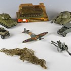 A small group of Dinky Toys military vehicles, comprising No. 699 Leopard recovery tank, with card base and bubble pack, Alvis tank, Chieftain tank, US Jeep, Volkswagen KDF, field gun and Spitfire aeroplane (some playwear).