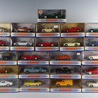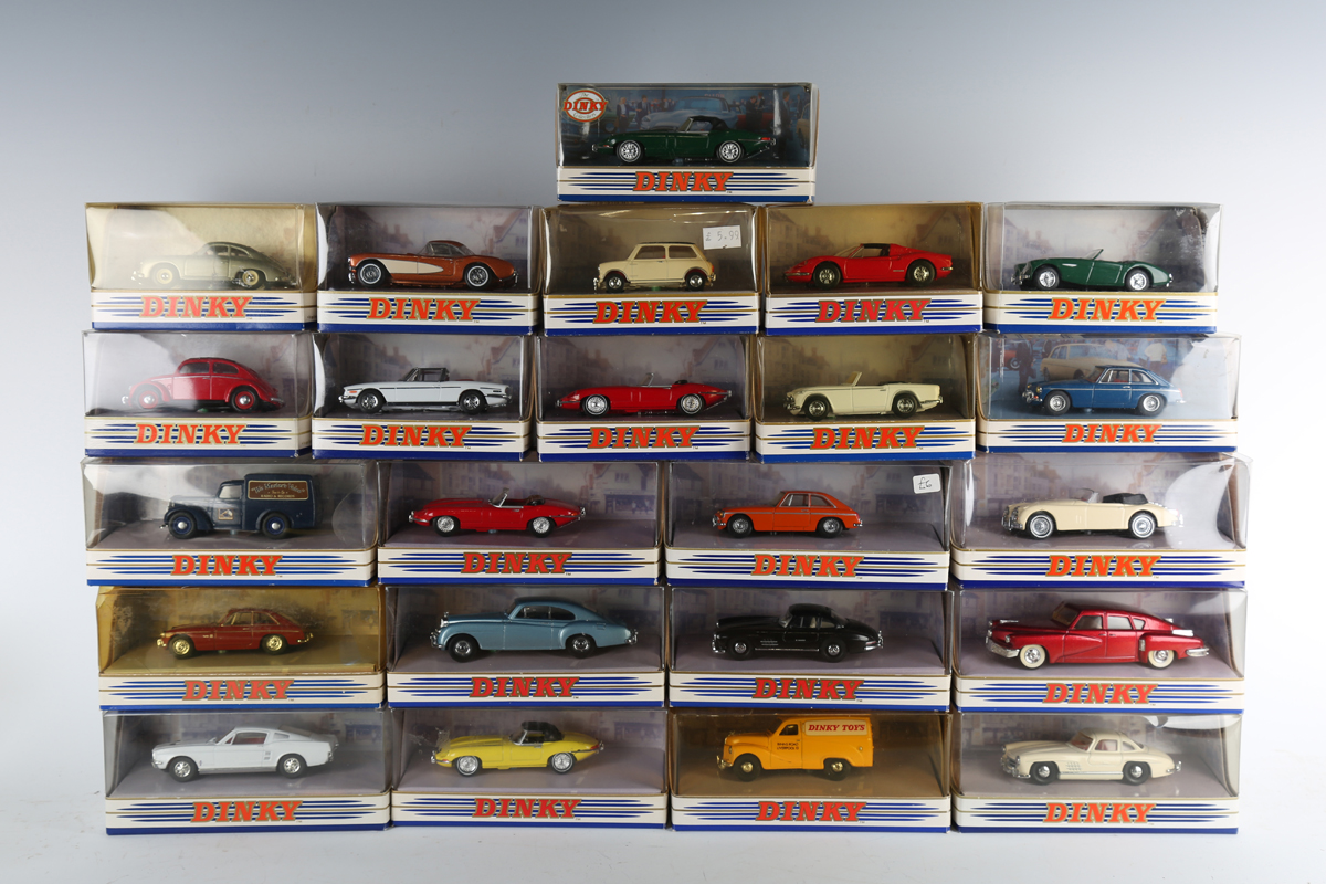 Twenty-three Matchbox The Dinky Collection vehicles, including two DY-18 1968 Jaguar E Type Mk 1½, DY-16b Ford Mustang Fast Back, DY-13 1955 Bentley R Continental and DY6-C 1951 Volkswagen Beetle, all within window boxes (some boxes damaged).