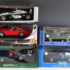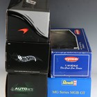 Five 1:18 scale model cars, comprising AutoArt Classic Division Jaguar XK-SS, Hot Wheels Ferrari 250GT, Kyosho MGB Mk1, Revell MGB GT and Paul's Model Art West McLaren Mercedes, all within window boxes (some boxes creased and scuffed).