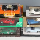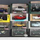 Three Art Model Ferrari Story 1:43 scale cars, comprising ARTS01 Ferrari 166 MM Bleu Museo Maranello, ART017 Ferrari 166 S Mille Miglia '50 Marzotto-Cristaldi, race number 650, and ART027 Ferrari 500 TRC Santa Barbera 1959 J. Brumby, together with a Minichamps MGB cabriolet 1962-69, a BMW 507 hard top and other model cars, all within plastic display boxes.