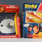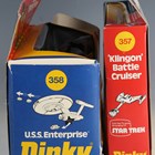 A Dinky Toys No. 358 USS Enterprise with shuttle and two torpedoes, together with a No. 357 Klingon Battle Cruiser, both boxed (boxes and plastic windows creased, torn and scuffed).