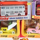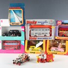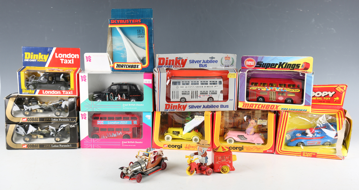 A group of diecast vehicles, comprising Corgi No. 2030 Kermit, No. 2032 Miss Piggy, two No.154 JPS Lotus F1, Dinky Toys No. 284 London Taxi, No. 297 Silver Jubilee Bus, Wiggins Teape No. 4700 Snoopy's Racer and six other vehicles, mostly boxed (some playwear, boxes creased, torn and scuffed).
