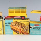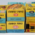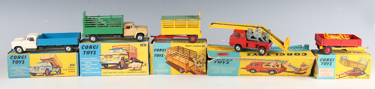 Six Corgi Toys farm vehicles and implements, comprising No. 64 conveyor on Jeep, No. 484 Dodge Kew Fargo livestock transporter and animals, No. 483 Dodge Kew Fargo tipper, No. 58 beast carrier, No. 56 four furrow plough and No. 62 farm tipper wagon, all boxed (boxes lightly creased and scuffed, Jeep box also lacking end flaps and three tabs), together with a group of Corgi Toys tractors, implements and figures.