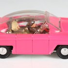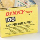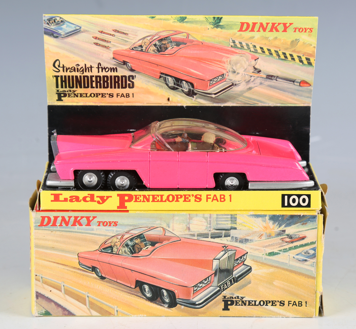 A Dinky Toys No. 100 Lady Penelope's Fab 1 with fluorescent pink body, missile, three harpoons and Lady Penelope and Parker figures, boxed with diorama (box and diorama creased torn and scuffed).