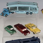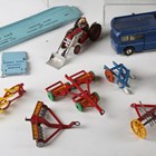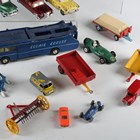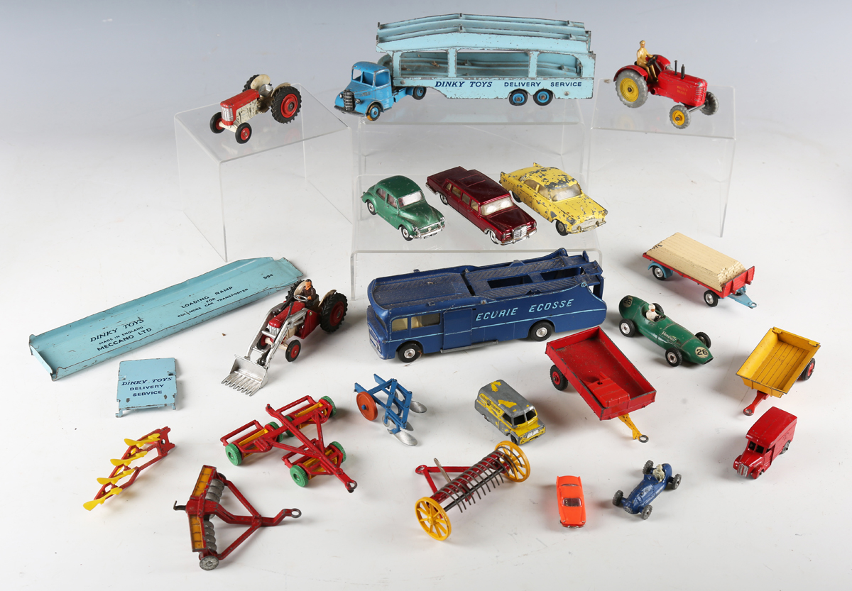 A group of diecast vehicles, including Corgi Toys Major No. 1126 Ecurie Ecosse racing car transporter, Dinky Toys Pullmore car transporter, Massey-Harris tractor, farm implements, Spot-On Morris Minor and Ford Zodiac (paint chips and faults).