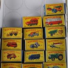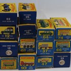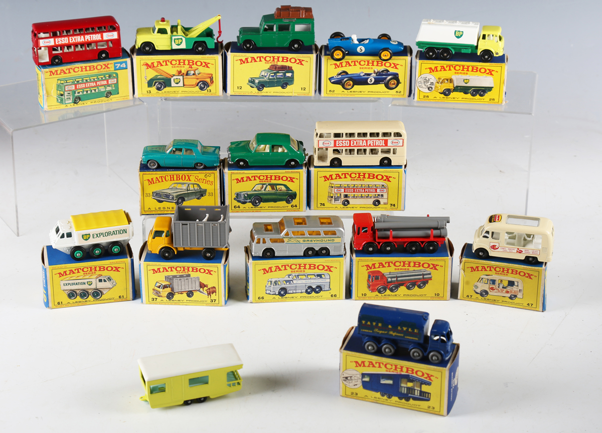 A collection of Matchbox Series 1-75 regular wheels vehicles, including No. 59 Fire Chief's car, No. 53 Ford Zodiac Mk IV, No. 13 Dodge wreck truck and two No. 74 Daimler buses, boxed and loose (paint chips and faults, boxes creased and scuffed, some lacking end flaps and tabs), together with a Matchbox carrycase.