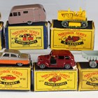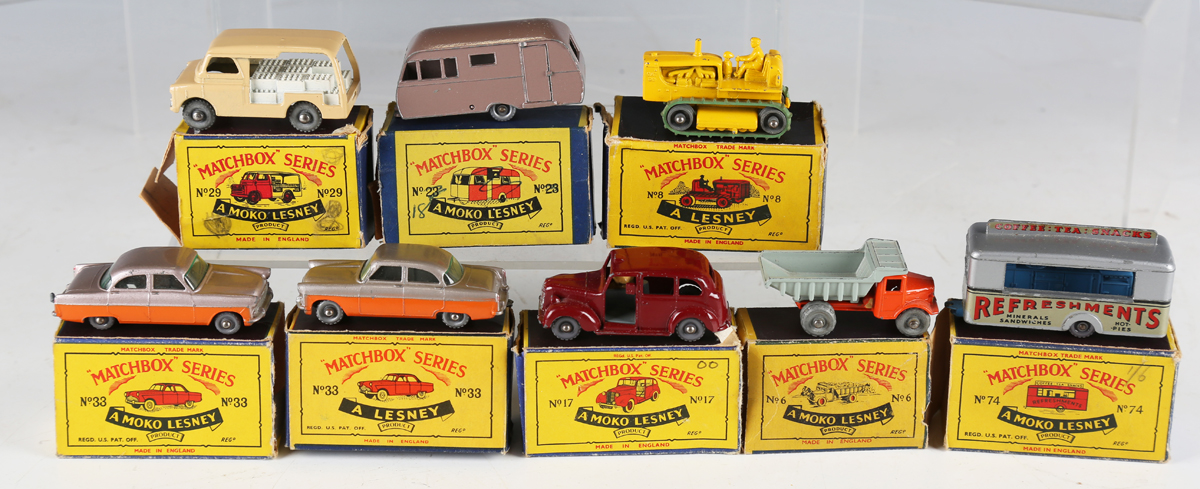 Eight Matchbox Series Moko Lesney and Lesney vehicles, including two No. 33 Ford Zodiacs, No. 17 Austin taxi and No. 6 tipper truck, all boxed (some paint chips, boxes damaged).