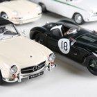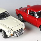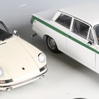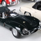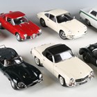 Seven AutoArt 1:18 scale diecast metal model cars, comprising Lotus Cortina, MGC, Alfa Romeo Giulietta (rear window loose), Porsche 911, Mercedes-Benz SL190, Jaguar XK SS and Jaguar C Type, race number 18.