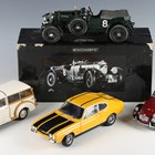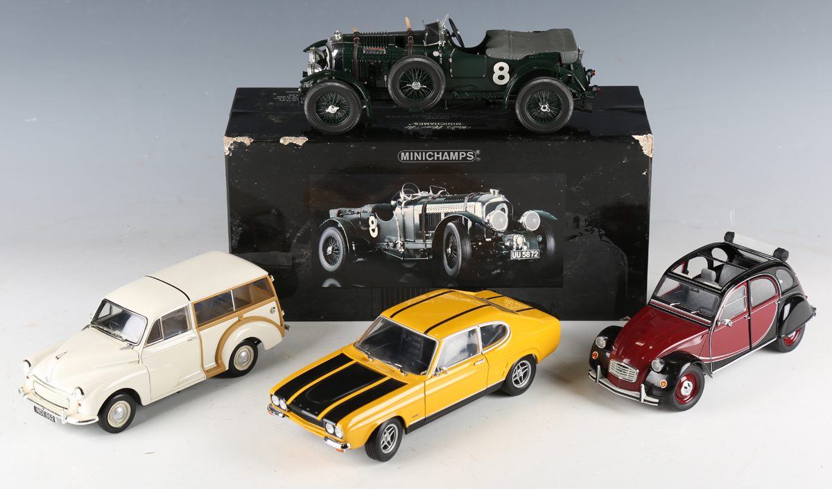 Four Minichamps 1:18 scale diecast metal model cars, comprising Bentley 'Blower' 4.5 litre, Le Mans 1930, boxed (box scuffed), 1969-74 Ford Capri, Morris Minor tourer and Citroën 2CV.