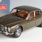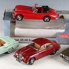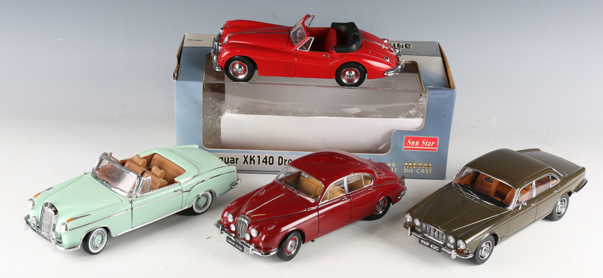 Two Paragon Models 1:18 scale diecast model cars, comprising Jaguar XJ6 Series 1 and Daimler V8-250, together with a SunStar Jaguar XK140 drophead coupe, within a window box, and a SunStar Mercedes-Benz 220 SE.