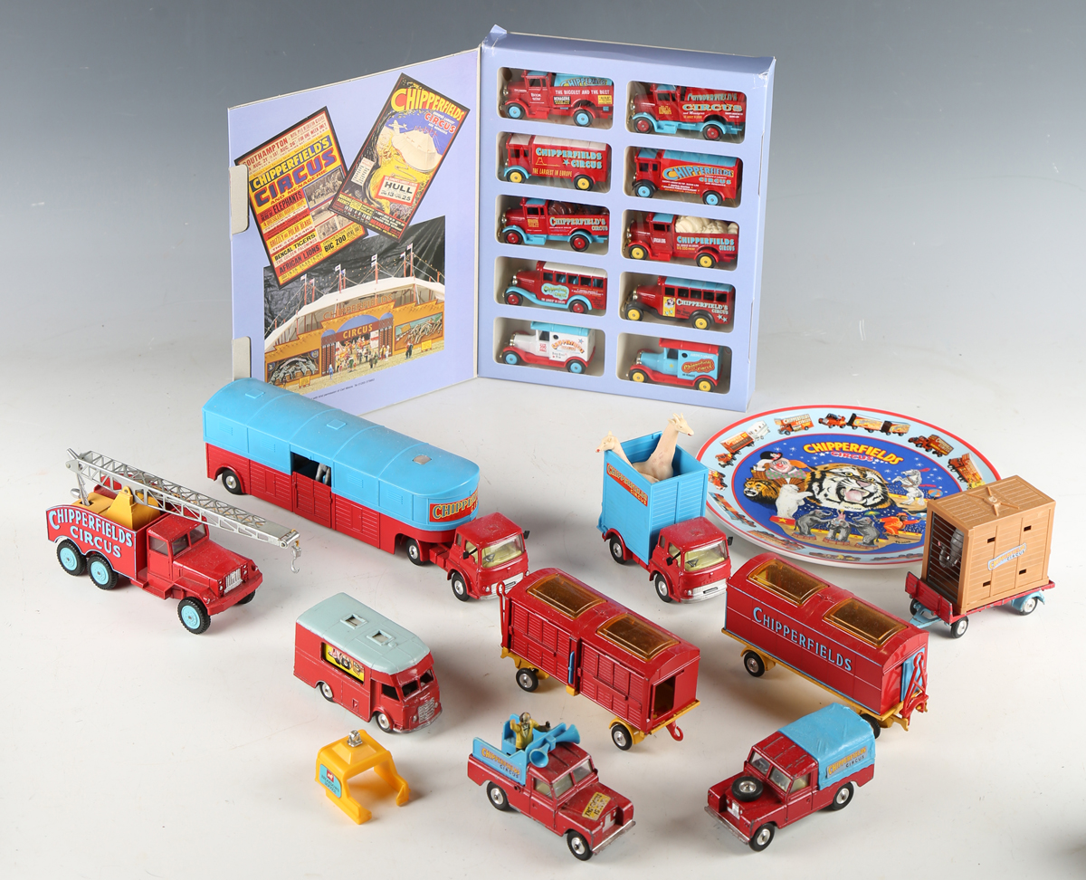 A small group of Corgi Toys Chipperfields Circus vehicles, including articulated horse box, giraffe transporter, mobile ticket office and crane truck, together with a Cameo Collectables Chipperfields Circus set, boxed, and a Royal Doulton limited edition plate, boxed.