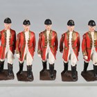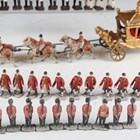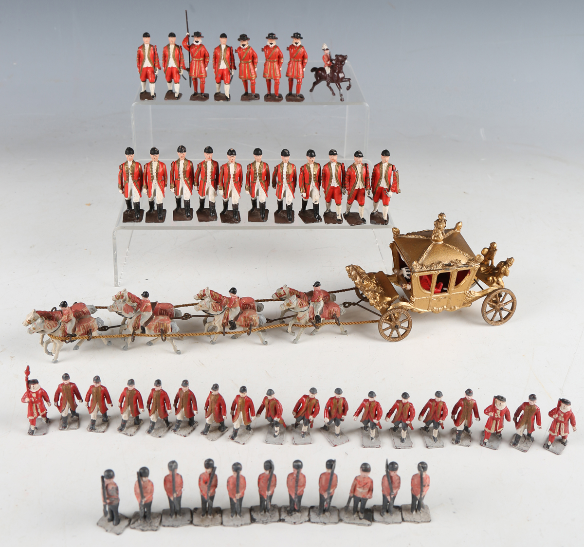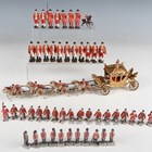 A Johillco diecast metal state coach with mounted Lifeguards and footmen, together with a group of Britains diecast lead figures of Beefeaters and footmen (paint chips).