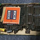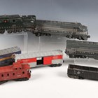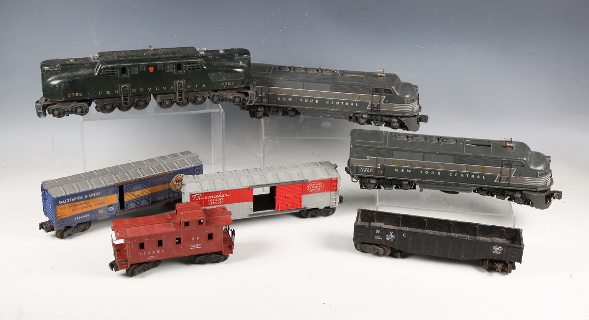 A Lionel O gauge three-rail diesel locomotive 2344 New York Central and matching dummy locomotive, a locomotive 2630 Pennsylvania (lacking pantographs), four items of goods rolling stock, track and controller (playwear).
