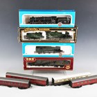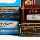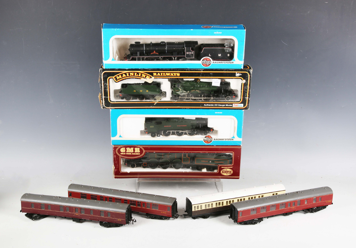 A small group of OO gauge model railway items, comprising Airfix locomotive 'Royal Scots Fusilier' and tender, Prairie tank locomotive GWR, Castle Class locomotive 'Caerphilly Castle' and tender GMR, Mainline locomotive 'Hinton Manor' and tender, all boxed, three Kitmaster coaches and an Airfix coach in GWR brown and cream.
