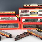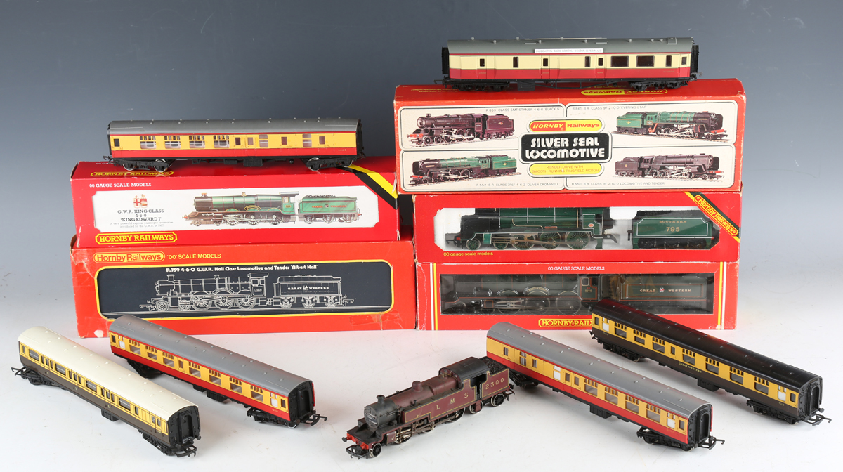 Five Hornby Railways OO gauge locomotives and tenders, comprising R.859 'Black Five', R.082 'King James II' GWR, R.759 'Albert Hall', R.078 'King Edward I' and R.154 'Sir Dinadan', all boxed, together with a tank locomotive 2300 LMS and six coaches.