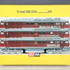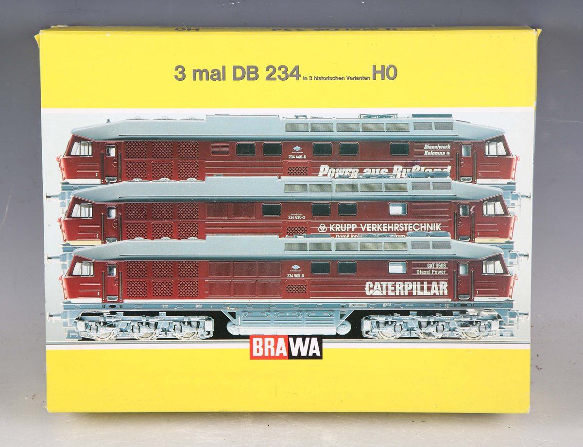 A Brawa HO gauge No. 0412 three diesel locomotive set, comprising 234-630-2 Krupp Verhehrstechnik, 234-440-6 Power aus RuBland and 234-565-0 Caterpillar (no motor), boxed.