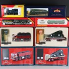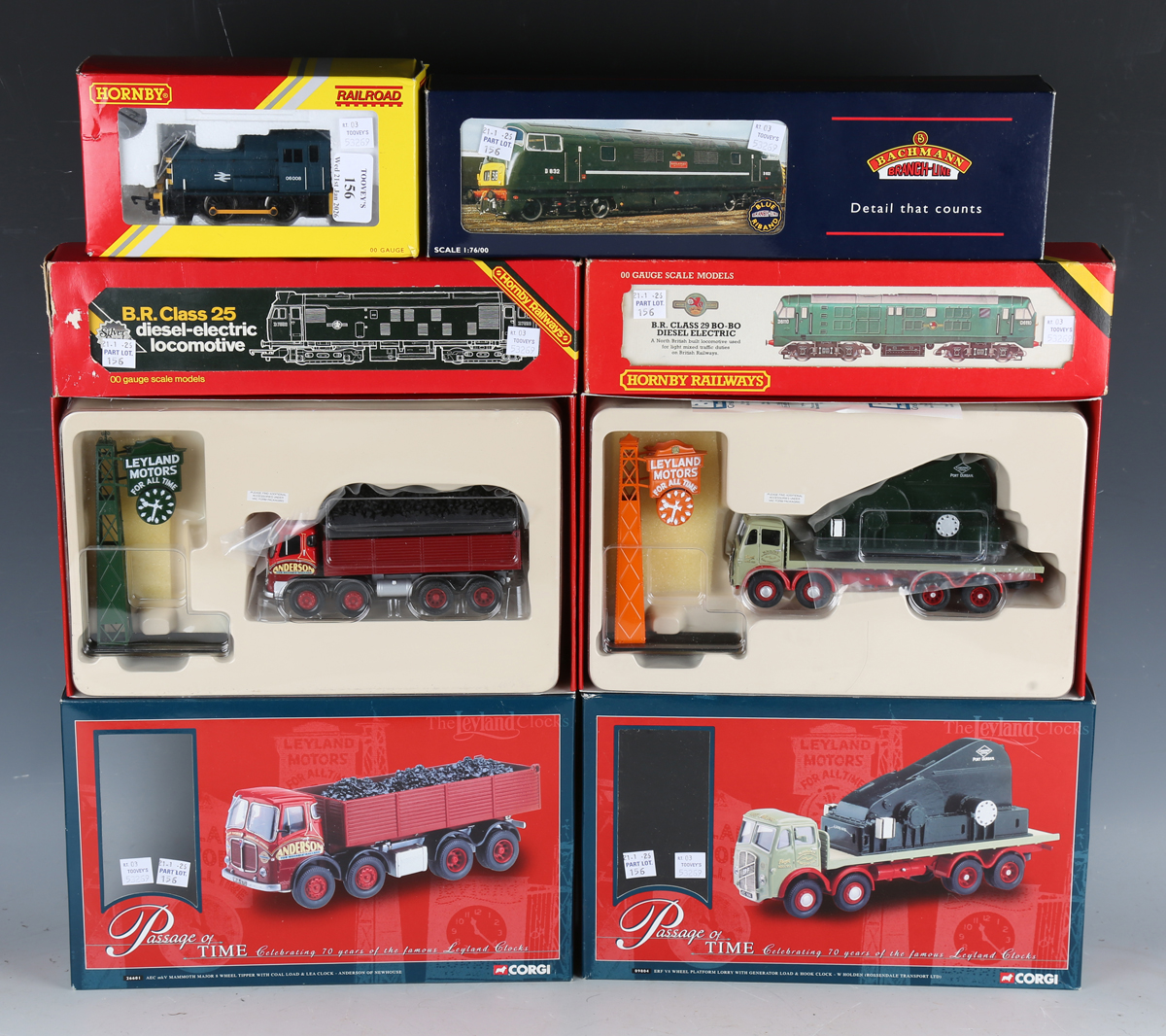 Two Hornby Railways gauge OO diesel locomotives, comprising R.072 BR Class 25 and R.080 Class 29, both in BR green, together with a Hornby R3065 Class 06 diesel locomotive in BR blue, a Bachmann Branch-Line No. 32-050 Class 42 Warship diesel locomotive D817 'Foxhound' in BR maroon, and two Corgi Passage of Time model lorries, all boxed.