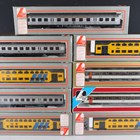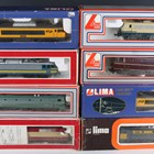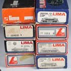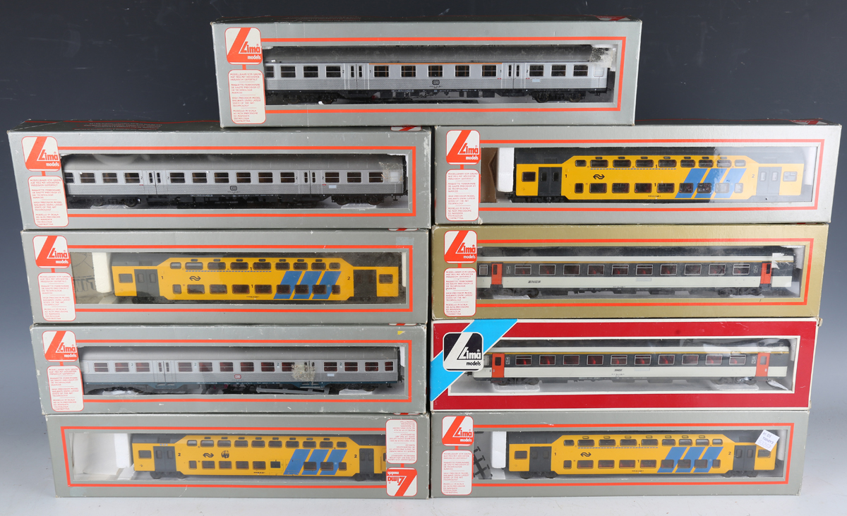 A group of Lima HO gauge railway items, comprising locomotives No. 208035, No. 208024, No. 208045LG, No. 208029, No. 208023L, No. 30-5353, No. 208055 and two No. 208108, three No. 309187K double-decker coaches, No. 309188LK double deck coach, five other coaches, all boxed, and Deltic locomotive D 6700 in BR green.