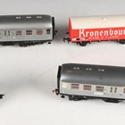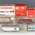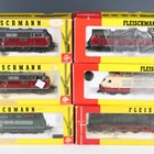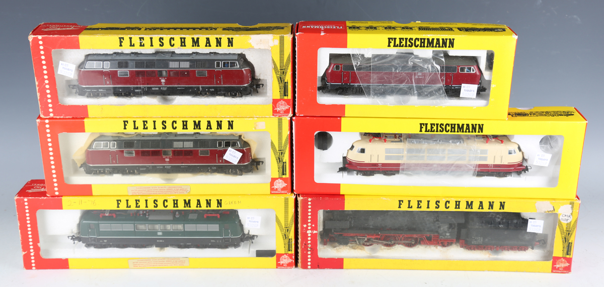 A group of Fleischmann HO gauge railway items, comprising two No. 4335 diesel locomotives, No. 4377 electric locomotive, No. 4380 electric locomotive, No. 4238 diesel locomotive, No. 1362 steam locomotive and tender, diesel locomotive 212-258-8, No. 96 5122 double-deck coach, five other coaches and goods rolling stock, boxed and loose, together with a quantity of track.