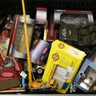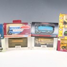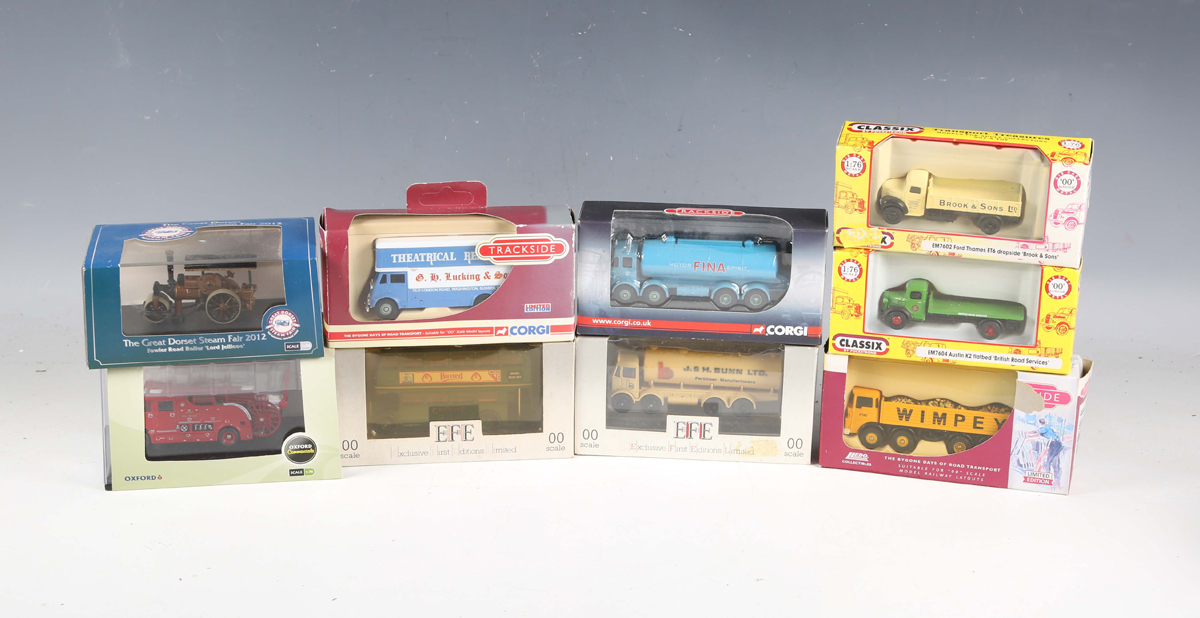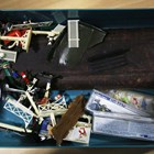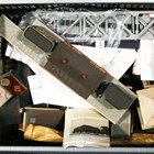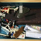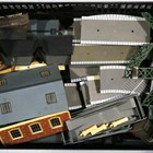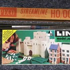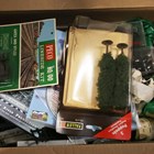 A group of OO gauge model railway lineside accessories, including buildings, figures, station accessories, vehicles and track.