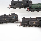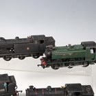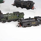 Three Hornby Dublo two-rail tank locomotives and four other tank locomotives with diecast metal bodies, various liveries.