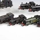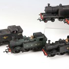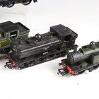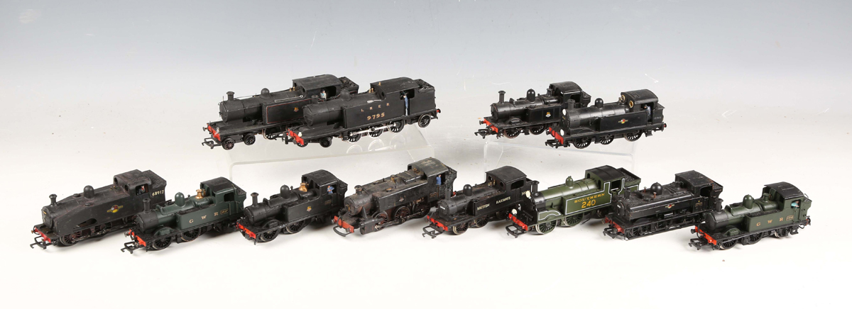 Twelve OO gauge tank locomotives, including Dapol 1427 in GWR green, Airfix 1408 in BR black and Bachmann 8743 in BR black.
