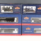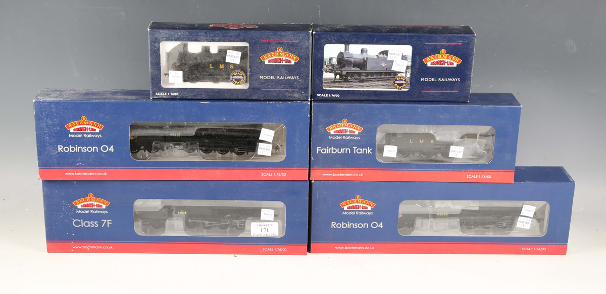 Three Bachmann Branch-Line locomotives and tenders, comprising No. 31-001 Robinson 04 63601, No. 31-013 Class 7 F 53808, both in BR black with late crest, and No. 31-002 Robinson 04 63635 in BR black with early emblem, together with three tank locomotives, all boxed.