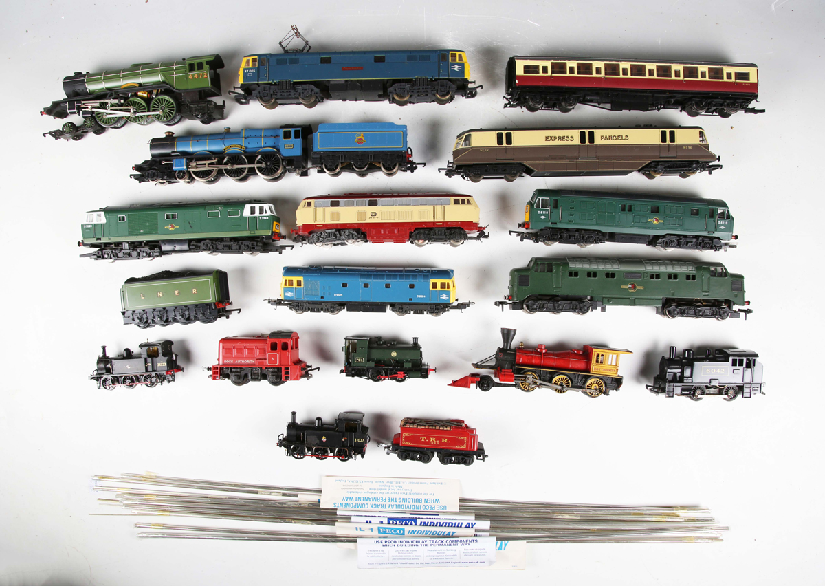 A group of OO gauge locomotives, including Hornby Dublo two-rail Deltic, two Hornby diesel locomotives, Tri-ang locomotive 'Flying Scotsman' and tender, three others and four Lima, together with an 'Express Parcels' van, a coach and a small group of track components (playwear and minor faults).