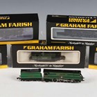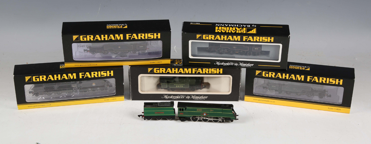 Four Graham Farish by Bachmann N gauge tank locomotives, comprising No. 372-753 42267 'Fairburn' in BR black with late crest, No. 372-529 4MT tank 80130 in BR lined black with late crest, No. 372-751 42096 'Fairburn' in BR black with early emblem, and No. 1703 general purpose tank 2579 Southern, all boxed, together with a No. 372-931 N Class 2-6-0 locomotive 31844 in BR black with early emblem, boxed, and a locomotive 21C1 'Channel Packet' and tender in Southern green.