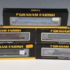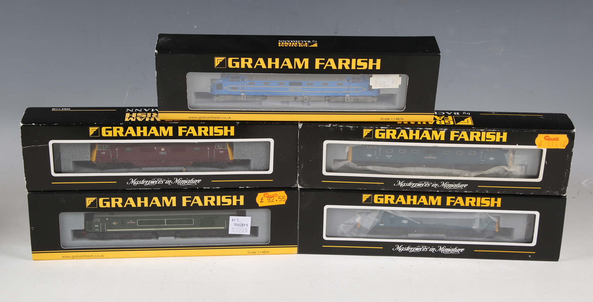 Five Graham Farish by Bachmann N gauge diesel locomotives, comprising No. 371-278 Class 55 locomotive 55008 'The Green Howards' in BR blue, No. 371-452 Class 37/0 diesel 37238 in BR blue, No. 371-575A Class 45 diesel D55 'Royal Signals' in BR green and No. 371-603 Class 42 diesel D815 'Druid' in BR maroon, all boxed.