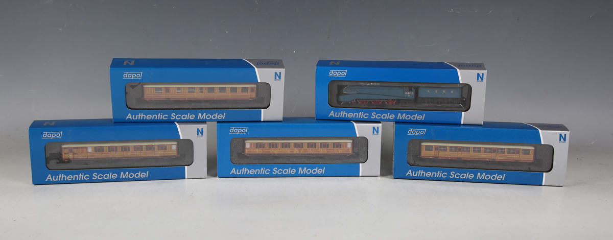 A Dapol N gauge No. 2S-008-008 A4 Valanced locomotive 4468 'Mallard' and tender in garter blue, together with four Gresley coaches, comprising No. 2P-011-201, No. 2P-011-002, No. 2P-011-103 and No. 2P-011-301, all boxed.