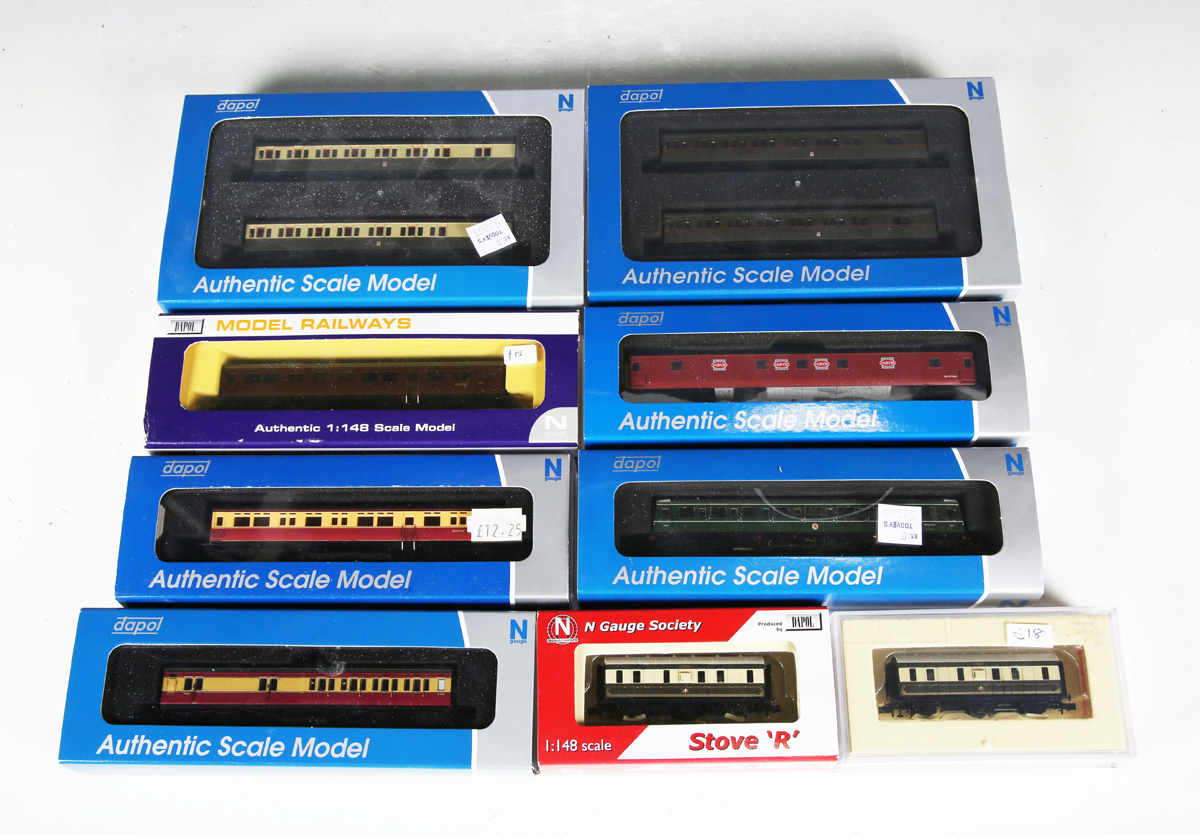 A small group of Dapol N gauge coaches and autocoaches, comprising No. 2P-003-009 B set twin coach pack Great Western, No. 2P-003-008 twin coach pack GWR, No. 2D-015-001 Class 122 in BR green with whiskers, No. 2P-004-004 autocoach in BR crimson and cream, No. 2P-012-654 Maunsell coach/brake in crimson and cream, No. 2P-006-004 MK3 sleeper Jervis Departmental DB, NC-025 autocoach in BR maroon and two Stove 'R' wagons in Pullman umber and cream, all boxed.