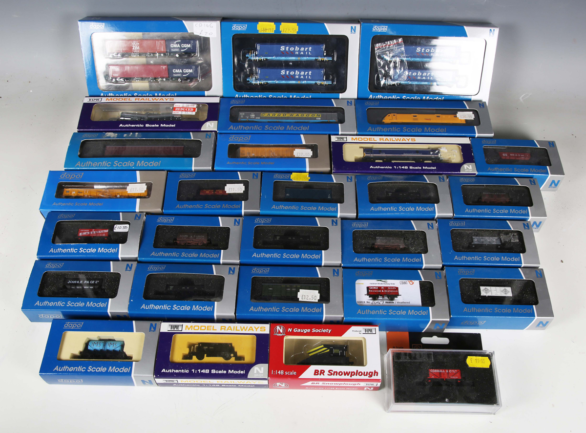 A group of Dapol N gauge railway items, including No. ND-012b CL.73 diesel locomotive 73136 Network Southeast, No. 2D-017-001 MK3 DVT locomotive 82145 Network Rail, three goods wagon twin packs and other goods wagons and tankers, all boxed.