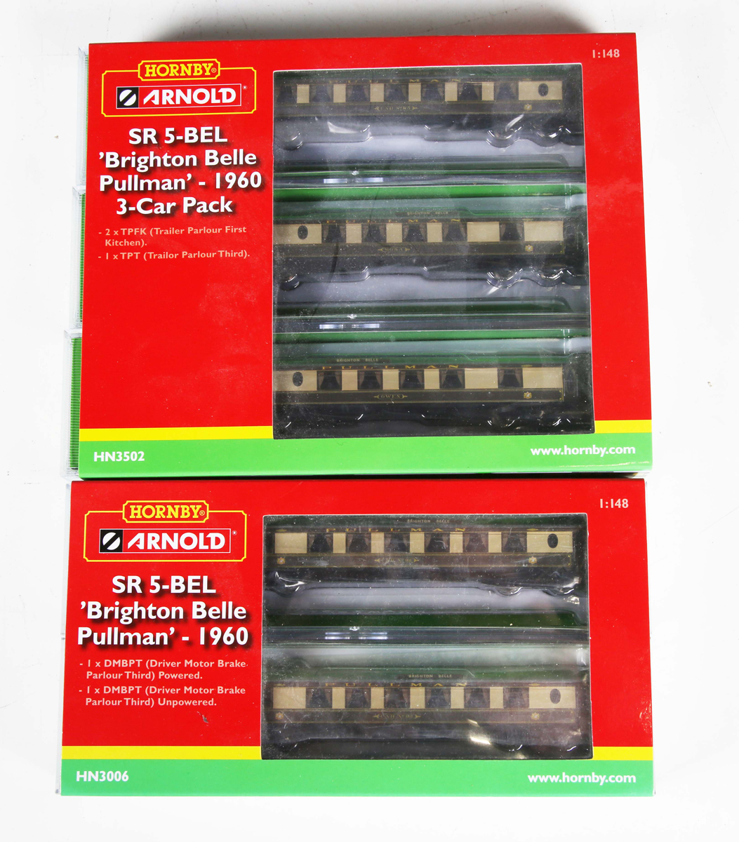 A Hornby Arnold N gauge HN3006 SR 5-BEL Brighton Belle Pullman 1960 two-car set, together with an HN3502 SR 5-BEL Brighton Belle Pullman 1960 three-car pack, both boxed.