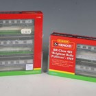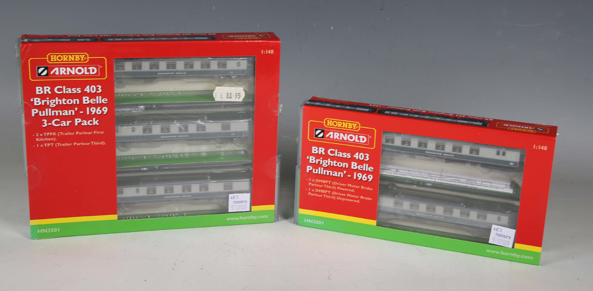 A Hornby Arnold N gauge HN3001 BR Class 403 Brighton Belle Pullman 1969 two-car set, together with an HN3501 BR Class 403 Brighton Belle Pullman 1969 three-car pack, both boxed.