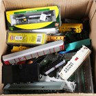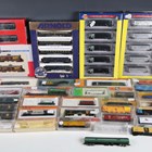 A group of N gauge American outline and Continental coaches and goods rolling stock, including Athearn No. 11676 Bethgon Coalporter, Athearn No. 11687 set, Walthers No. 932-28956 smoothside box car set, Arnold No. 0319 five-coach pack, mostly boxed, and Micro Trains A/B unit locomotive Baltimore & Ohio, boxed.