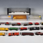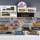 A group of Bachmann and Spectrum from Bachmann N gauge American outline railway items, including No. 81158 2-8-0 Consolidation locomotive and tender 2360 Boston and Main, No. 81456 EMC gas electric coach Santa Fe, diesel locomotives, caboose, box cars and crane cars, boxed and loose.