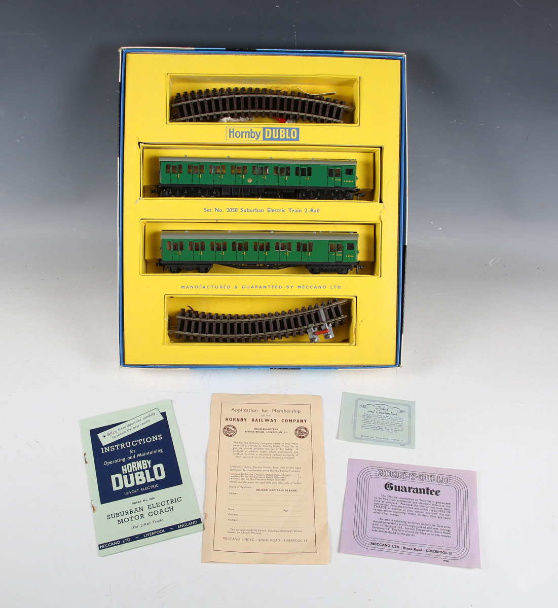 A Hornby Dublo two-rail No. 2050 Suburban Electric Train set, boxed with guarantee, instruction and membership application form (box lid lightly creased and scuffed).