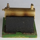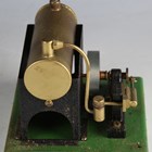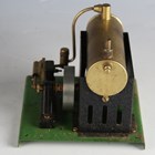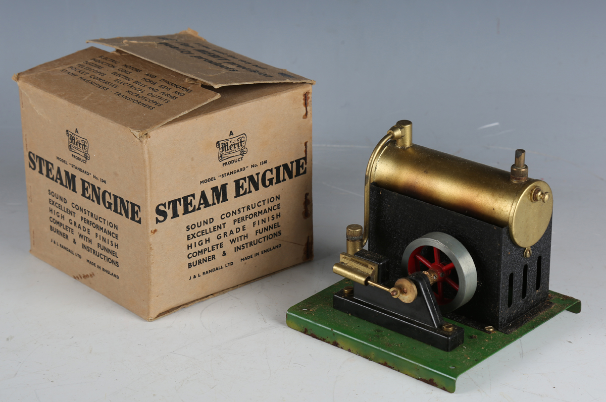 A Merit Product spirit-fired horizontal steam engine with 4.5cm flywheel, on a green plinth base, boxed with instructions.
