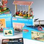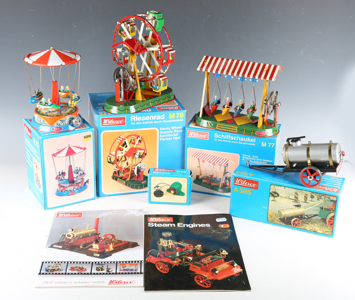 Six Wilesco accessories, comprising M78 Ferris wheel, M70 roundabout, M57 transmission, M77 swing-boat, M66 dynamo and A385 watercart, all boxed (some boxes creased, torn and scuffed).