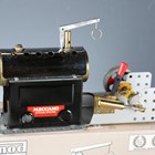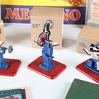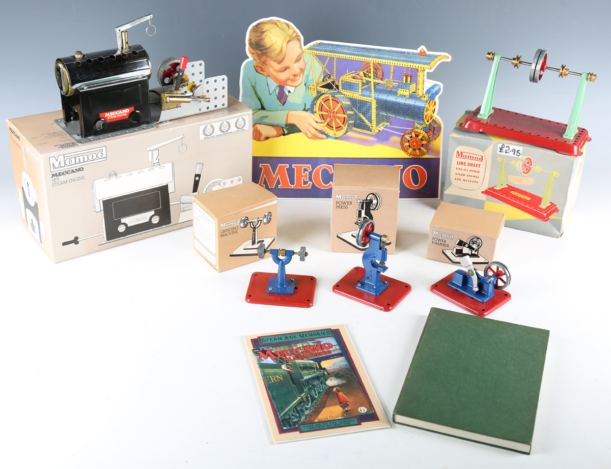A Mamod Meccano SP3 steam engine and four accessories, comprising line shaft, power press, grinding machine and power press, together with a reproduction Meccano counter display card, a 'Meccano Constructors' Guide' book by B.N. Love and a preproduction Meccano Christmas card (boxes lightly scuffed).